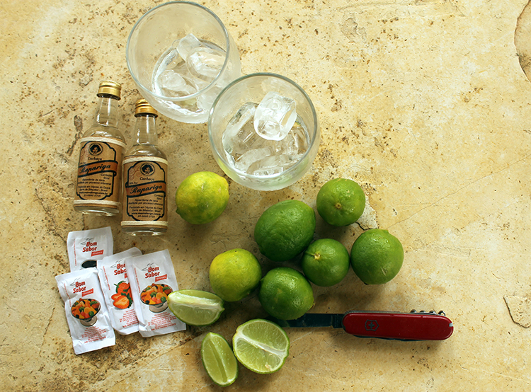little bottles of cachaça, a couple of sugar packets, my pocket knife and the nifty wooden stir